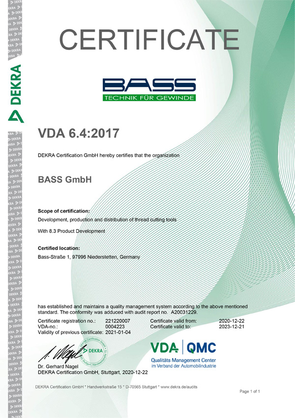 The brand BASS stands for consistently high quality for cutting internal threads worldwide. Our modern production provides an optimal production environment for development and production of our tools. Through our employees’ high awareness of quality, the quality-management-system aligned to our customers is constantly being developed.